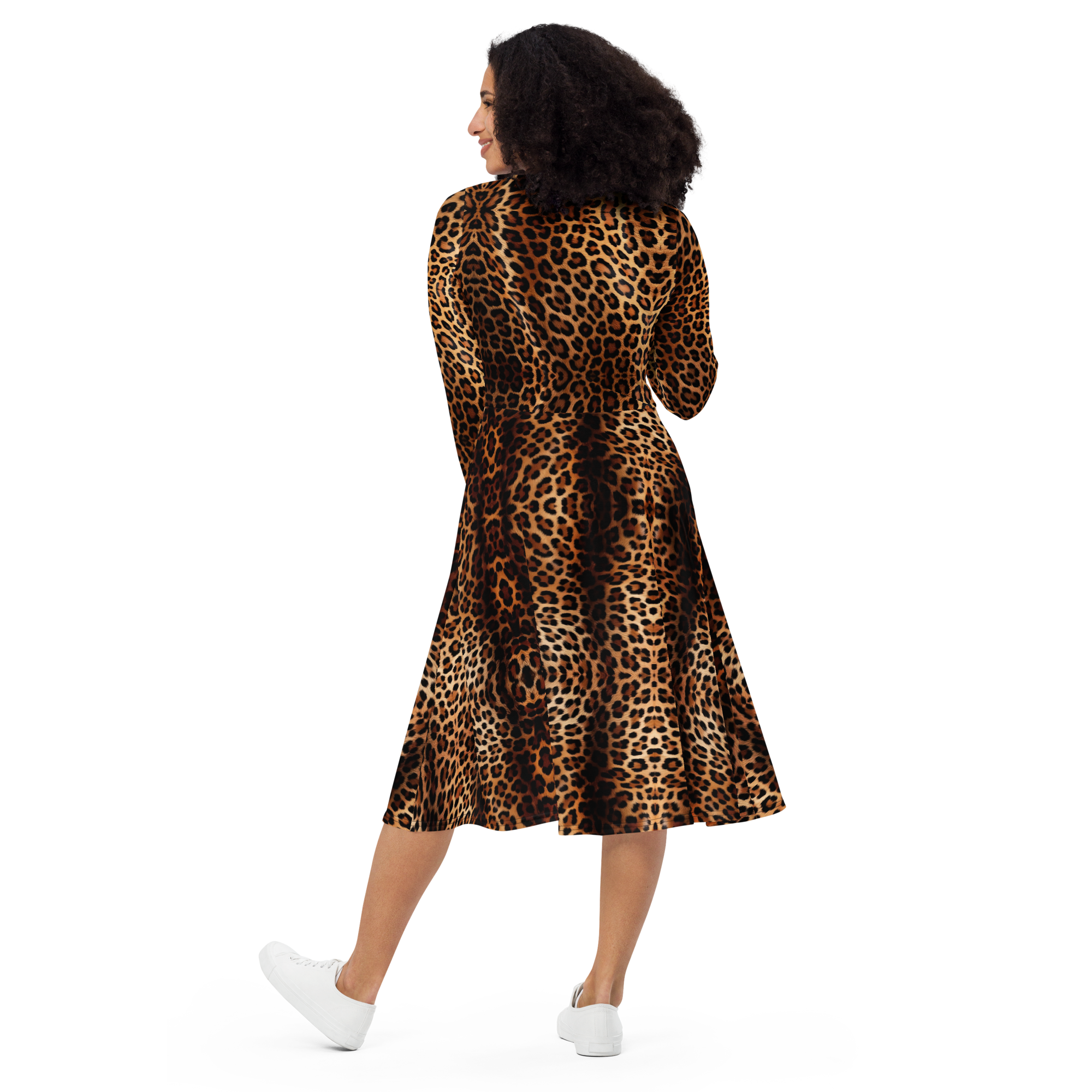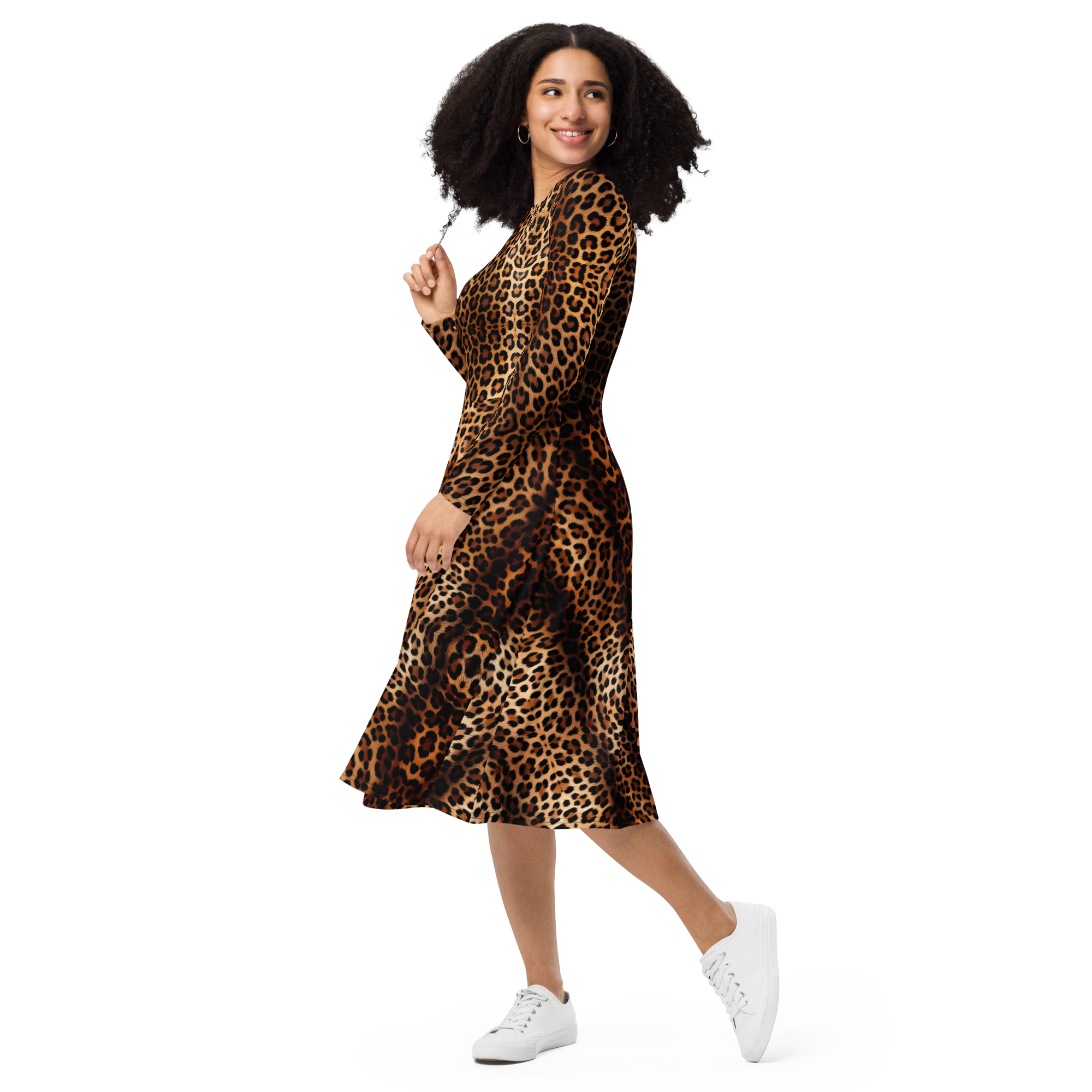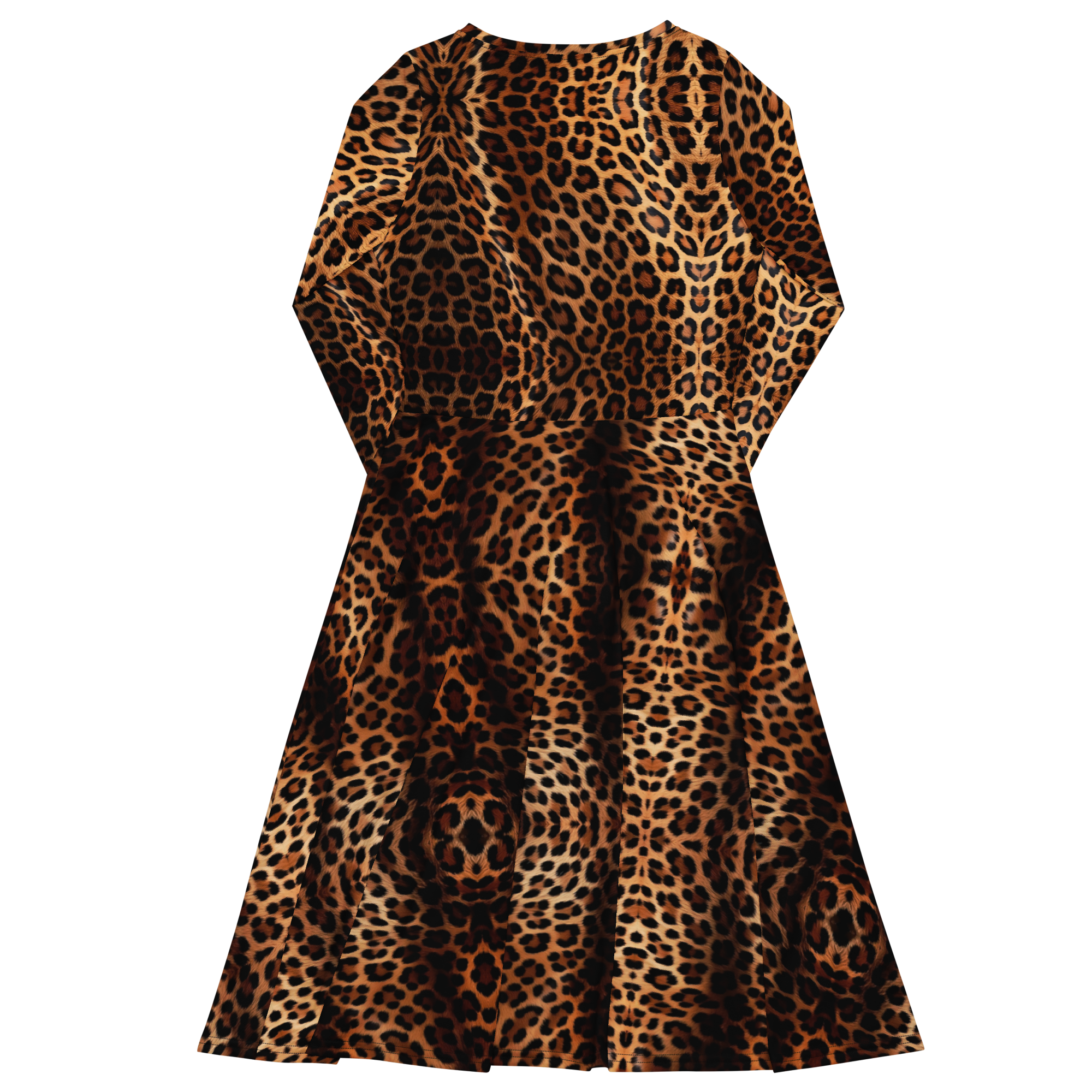 leopard pattern All-over print long sleeve midi dress/ヒョウ柄長袖ミドルワンピース